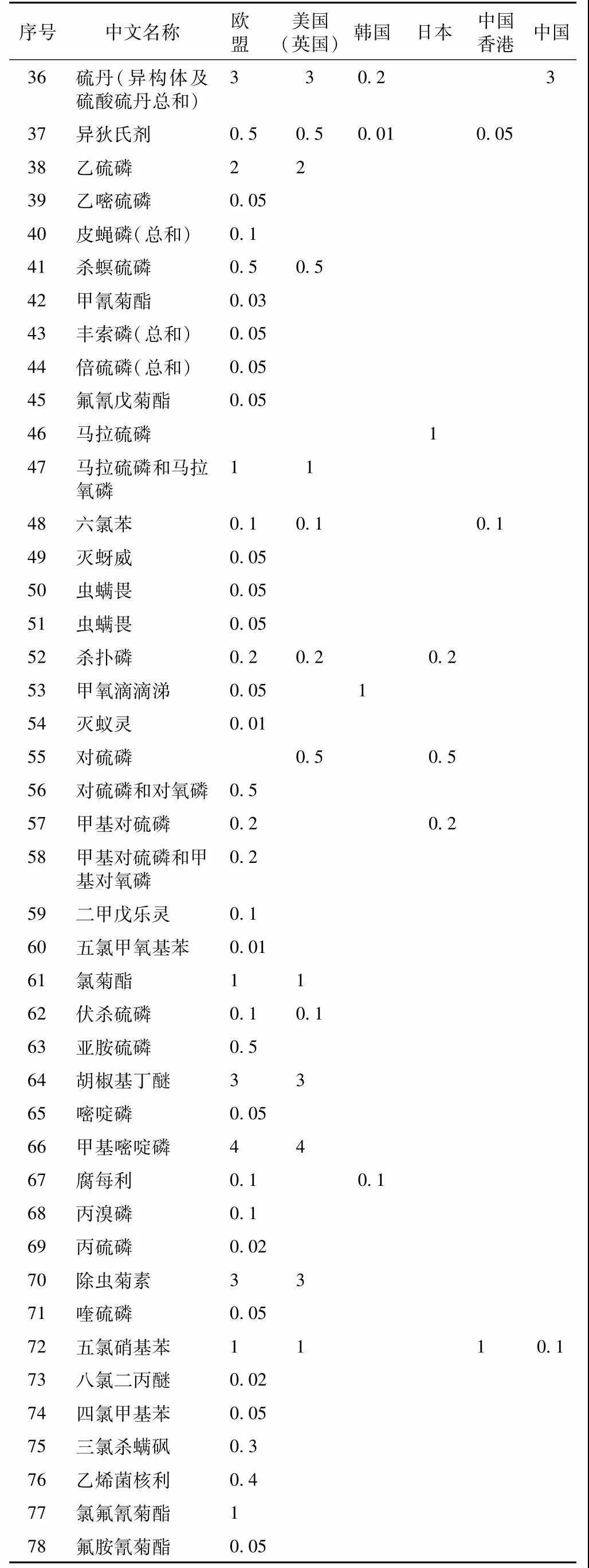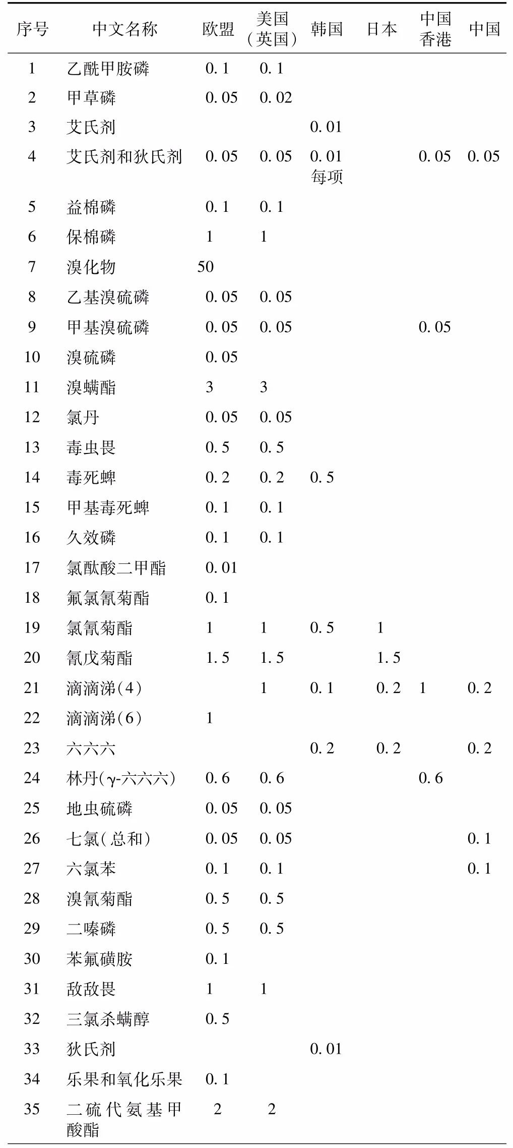 各国家和地区的植物药,农药残留限量标准不同。《欧洲药典》、《美国药典》涉及植物药农药残留共76种(部分以总和统计),各种农药之间的限量值差别很大,《欧洲药典》和 《美国药典》是当前世界上农药残留限量最多的药典,欧盟的植物药农药残留限量标准比较完善,美国的植物药农药残留限量标准完善程度次于欧盟。韩国、日本的植物药农药残留限量标准相对欧盟、美国的植物药农药残留限量标准检测指标较少。但在亚洲国家药典中,《韩国药典》涉及检测的限制类农药较多,还规定了部分农药在常见植物药中的限量,比较实用,可供我国农残限量标准制定提供参考。而日本对植物药的农药残留限量要求太过严格,但涉及的植物药的农药种类相对偏少。《英国药典》的农残限定方式相对粗略,只是对植物药中的农药进行了概括性限制;有机氯农药的限制为0.05 mg/kg,其他农药限制为0.5 mg/kg或 1.0 mg/kg。以 《中华人民共和国药典》为中心的我国中药材质量标准体系中,目前涉及农药残留量检测的指标和品种还较少。另外,我国具有农药登记信息的中药材品种数量很少,中药材农药登记的制度不完善,这也影响到我国中药材种植过程中农药的正确使用。具体如表所示。